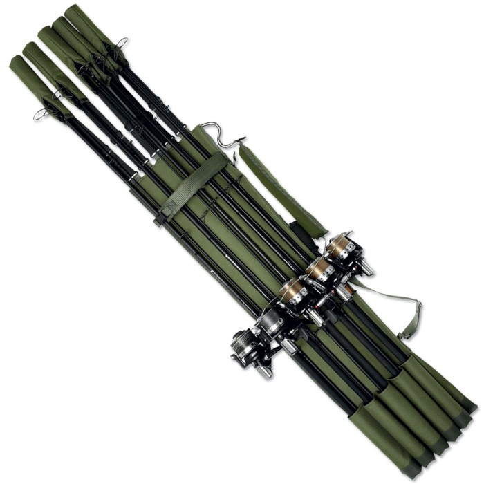 A 5-rod quiver system with removable butt protectors and elasticated rod retainers, suitable for both 12ft and 13ft rods. Dimensions: L125cm x W30cm.