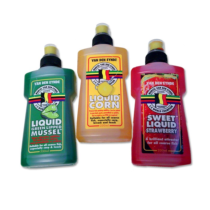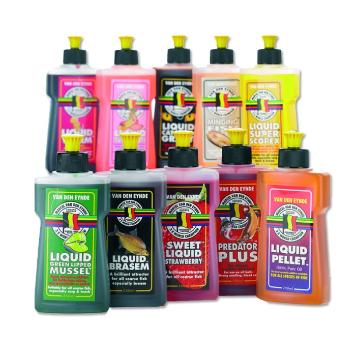 Van Den Eynde Liquid Additives, Strawberry: a sweet additive for summer fishing. Spray it onto groundbaits or hook bait. Much loved by big roach. Molasses: many top bream anglers swear by Liquid Molasses for added attraction to groundbait. Sweet and sugar-based. Brasem: a sweet, caramel flavour and aroma makes this Liquid Brasem a perfect summer additive to any bream groundbait. Pellet: brilliant for carp, Van Den Eynde Liquid Pellet can be squirted onto baits and groundbaits or used as part of a paste mix. Other liquid additives include corn, cheese, meat, green lipped mussel, scopex, tutti frutti, worm and predator plus.