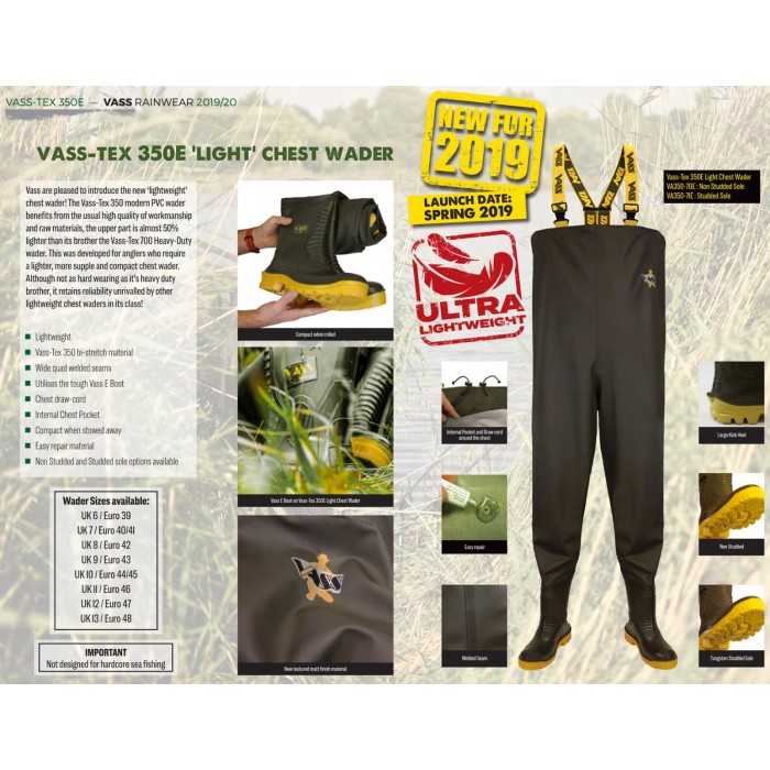 Lightweight chest waders, available in sizes 8-12, these Vass waders boast quad welded seams, which keep the water at bay, and stand up well to the stresses and strains of an active angling lifestyle.
